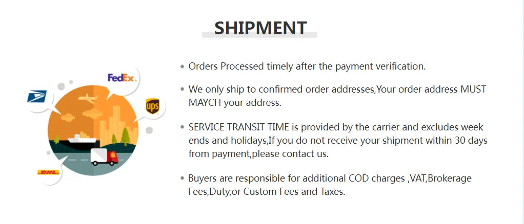 Shipping Carriers: We use reputable carriers like UPS, FedEx, and USPS to ensure your package arrives safely and on time.
